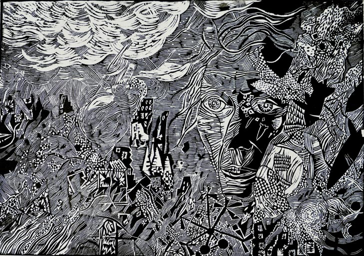 Copyright by VG Bild - Germany Elke Daemmrich Detonation, Linolschnitt, 42 x 60 cm, 2024 Detonation, linogravure, 42 x 60 cm, 2024 Detonacion, linograbado, 42 x 60 cm, 2024 Detonation, linocut, 42 x 60 cm (17" x 24"), 2024