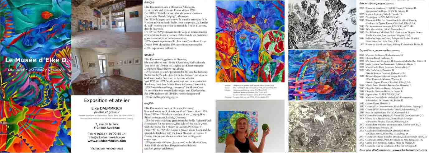 elkedaemmrich@aol.com, info@elkedaemmrich.com Deutschland Elke Daemmrich Bärensteiner Str. 18 01277 Dresden Tel.: 0178 805 93 92 Frankreich Elke Daemmrich "Le Musée d'Elke D." 3, rue de la Paix 34480 Autignac