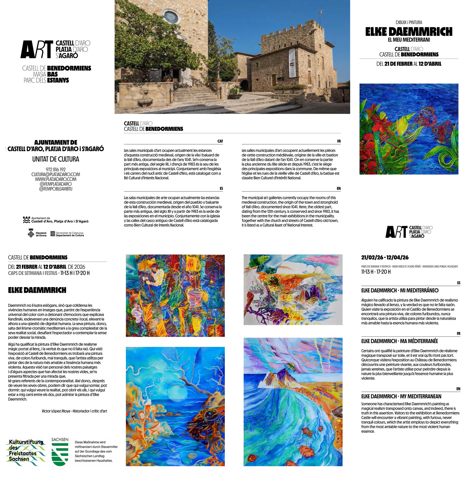 From February 21 to April 12, 2026 Elke Daemmrich "El meu Mediterrani - paintings" Castillo de Benidormiens 17249 Castell d'Aro Castell - Platja d'Aro - Sant Agaro Spain Inauguration : Saturday, February, 21, 2026 at 12 a.m. Open hours : Sa and Su: 11 - 13:00 and 17 - 20:00 Edition of a catalog.