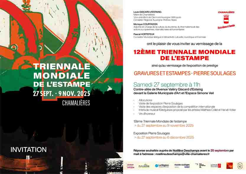 Pour cet automne 2025 Elke Daemmrich prépare deux expositions personnelles en France: à la Chapelle du Tiers-Ordre à Perpignan, organisée par la ville de Perpignan, vernissage le 11 décembre 2025 et au Château Vargoz à Serignan, vernissage le 7 novembre 2025. __________________________________________________________________ Du 27 septembre au 9 novembre 2025 TRIENNALE MONDIALE DE L'ESTAMPE Chamalières La Triennale montre 21 expositions, entre autre les gravures de Pierre Soulages à la Galerie d'Art Municipale et les mezzotintes de Mario Avati au Salon d'honneur du Pole Culturel Fontmaure. La Cleveland Suite d'Elke Daemmrich est à voir à l'Espace Simone Veil et à la Chapelle Fontmaure. Inauguration : par Louis GISCARD d'ESTAING, maire de Chamalières le 27 septembre 2025 à 11 heures Contre-allée de l'Avenue Valéry Giscard d'Estaing devant la Galerie d'Art Municipale et l'Espace Simone Veil 63400 Chamalières (Clermond Ferrand) Edition d'un catalogue. ![]() ![]() ![]() __________________________________________________________________ Pendant l'été 2025 Elke Daemmrich est invitée à faire des residences d'artistes aux Richard-Wagner-Stätten Graupa, au NOMOS Forum à Glashütte et au Symposion VIA REGIA du GEDOK Mitteldeutschland à Leipzig, Allemagne. __________________________________________________________________ Du 8 juin au 17 aoüt 2025 Elke Daemmrich est invitée à cet exposition par le Cercle de Daniel Henry Kahnweiler. Elke Daemmrich « Mediterran » Peintures et gravures Museum für Kunst Speyerstr. 3 67806 Rockenhausen Allemagne Vernissage : Dimanche, 8 juin, 2025 à 15 heures. Horaires : Ma - Di: 14h30 - 17h30 et sur rendez-vous ![]() ![]() ____________________________________________________________________ Expositions collectives d'Elke Daemmrich - 2024/2025 Du 21 mars au 28 juillet 2025 "Tout en couleurs" - La collection municipale Salles "Coté jardin" Musée d'Art Moderne et contemporain 39, Grand rue Raymond VII 81170 Cordes-sur-Ciel Du 23 novembre 2024 au 26 janvier 2025 38. Leipziger Grafikbörse "Spielräume" Museum für Druckkunst, Leipzig, Allemagne. Vernissage : le 22 novembre 2024 a 19 h Edition d'un catalogue. ![]() L'exposition est itinérante, les prochaines stations sont: du 2 février au 6 avril 2025 - Grafikmuseum Stiftung Schreiner, Bad Steben, du 12 avril au 7 septembre 2025 - Kloster Ilsenburg, du 1 juillet au 15 octobre 2025 - Museum Schloss Burgk, du 13 septembre au 2 novembre 2025 - Museum und Kunstsammlung Schloss Glauchau, de janvier en avril 2026 - Staedtisches Museum Eisenhuettenstadt, Allemagne. Du 5 au 20 décembre 2024 "Nouvelles perspectives" Salon de l'A.I.A.P. - Comité National Monégasque auprès de l'UNESCO, sous la présidence d'honneur de S.A.S. Le Prince ALBERT II, Salle d'exposition de la Principauté, Port de Monaco, Principauté de Monaco. Inauguration : le 5 décembre 2024 a 17 h 30 Edition d'un catalogue. ![]() ![]() Du 1 au 3 novembre 2024 15ème rencontre artistique Monaco - Japon Auditorium Rainier III, Principauté de Monaco. Inauguration : le 1 novembre 2024 a 17 h Edition d'un catalogue. ![]() ![]() ____________________________________________________________________ Du 28 janvier au 10 mars 2024 "Entre les mondes" Peintures, gravures et dessins d'Elke Daemmrich Château Royal Quai de l'Amirauté 66190 Collioure Vernissage : le 9 février 2024 à 18h30 Exposition organisée par le Departement 66, Perpignan ![]() ![]() ____________________________________________________________________ Du 26 novembre 2023 au 18 janvier 2024 Elke Daemmrich est finaliste du Prix d'Arte Europeén 2023 de la Fondation Bernd et Gisela Rosenheim "Guerre et paix" Haus der Stadtgeschichte Offenbach am Main Allemagne Vernissage : le 25 novembre 2023 à 18h Edition d'un catalogue ![]() ![]() ____________________________________________________________________ Du 29 septembre 2023 au 23 février 2024 Elke Daemmrich Flora Mythologica et gravures de trois decennies Stadtmuseum / Kleine Galerie Obermarkt 1 04720 Döbeln Allemagne Vernissage : vendredi, le 29 septembre 2023 à 19h30 Salutation : Kathrin Fuchs, directrice de la galerie Présentation de l'exposition : Elke Daemmrich, artiste Horaires : Ma 10 - 18h, Me + Jeu 10 - 16h Ve 9 - 12h, tous le premiers et troisièmes samedis du mois 14 - 17h ![]() ![]() ____________________________________________________________________ Du 8 septembre au 1 octobre 2023 Elke Daemmrich « Zwischen den Welten » Peintures et gravures Kunstverein Eisenturm Fritz-Arens-Platz 1 55116 Mayence Allemagne Vernissage : Vendredi, le 8 septembre 2023 à 19 heures Laudatio : Miriam Maslowski, historienne d'art Horaires : Sa + Di 13 - 17h ![]() ![]() ____________________________________________________________________ Du 9 juillet au 27 aout 2023 Elke Daemmrich « Zwischen den Welten » Peinture, gravure, dessin Kunstwandelhalle Badstr. 6 08645 Bad Elster Allemagne Vernissage : dimanche, le 9 juillet 2023 à 11 heures Horaires : Me - Ve 14h - 17h30, Sa + Di 9h30 - 12h + 14h - 17h30 ![]() ![]() ![]() ____________________________________________________________________ Expositions collectives d'Elke Daemmrich - Eté / automne 2023 Du 7 octobre au 12 novembre 2023 "AWAGAMI - International Miniature Print Exhibition" Awagami Factorys Hall of Awagami Japanese Paper 136 Kawahigashi, Tokushima 779-3401 JAPON Du 30 juin au 30 juillet 2023 "IMMIGRANT CENTURIES" A.I.R. Gallery 155 Plymouth Street Brooklyn, NY, 11201 Etats Unis Du 1 juillet au 24 septembre 2023 37. Leipziger Grafikbörse "Turbulenzen" Museum Schloss Burgk, Burgk, Allemagne Vernissage : 1 juillet 2023 à 16 h Edition d'un catalogue ![]() 43. MINI PRINT INTERNATIONAL OF CADAQUES Du 24 juin au 31 aout 2023 Taller Galeria Fort, Cadaquès, Espagne Vernissage : 24 juin 2023 à 19 h Du 30 juin au 30 juillet 2023 Wingfield Barnes, Wingfield, Grande Bretagne L'exposition voyage en automne 2023 a la Fundacio Tharrats d'art grafic, Pineda de Mar (Barcelona), Espagn